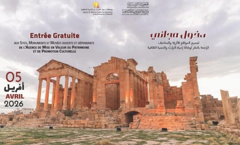 أعلنت وكالة إحياء التراث والتنمية الثقافية في تونس أن الدخول إلى جميع المواقع الأثرية والمعالم التاريخية والمتاحف المفتوحة التابعة لها سيكون بصفة مجانية، وذلك يوم الأحد 5 أفريل 2026.
