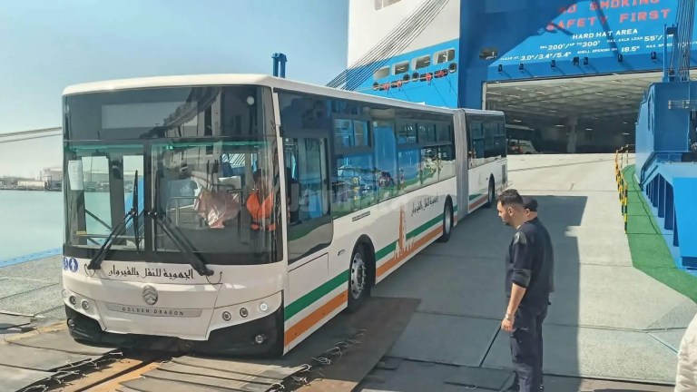 تسلمت السلطات التونسية اليوم الاثنين الدفعة الأخيرة من صفقة الحافلات الصينية الجديدة، والتي تضم 136 حافلة. وحطت الحافلات بميناء حلق الوادي.
