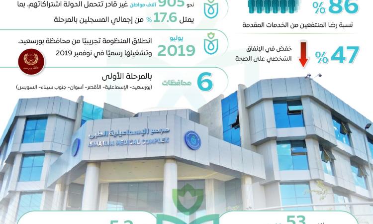 من ناحية أخرى، أظهرت الإنفوجرافات المؤشرات الإيجابية للمرحلة الأولى، والتي بدأت تجريبيًا في يوليو 2019 في بورسعيد. شملت المرحلة الأولى ست محافظات، وسجل بها أكثر من 6 ملايين مواطن، مع استفادة نحو 5.2 مليون مواطن من الخدمات. وقد وصل معدل رضا المنتفعين إلى أكثر من 86%، مع خفض الإنفاق الشخصي على الصحة بنسبة 47%.