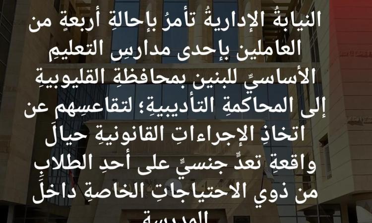 أحالت النيابة الإدارية المصرية، أربعة عاملين بإحدى مدارس التعليم الأساسي للبنين بمحافظة القليوبية، إلى المحاكمة التأديبية العاجلة.