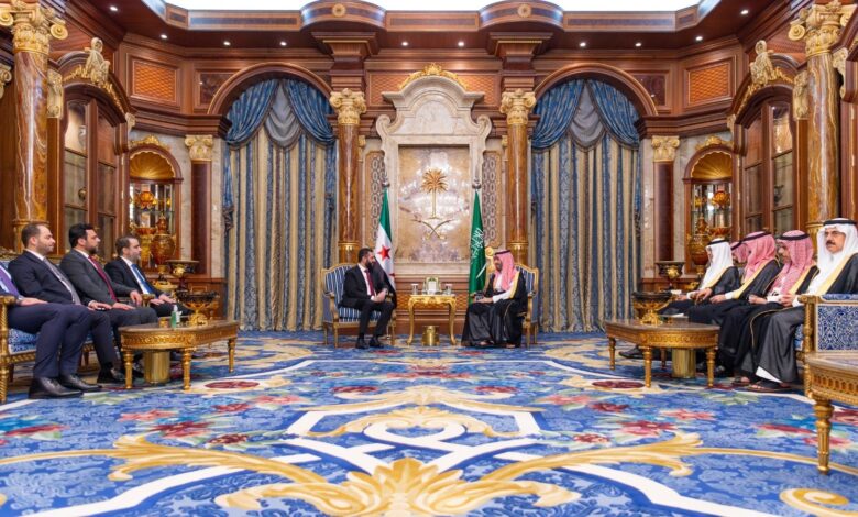التقى الرئيس السوري أحمد الشرع، الثلاثاء، بولي العهد السعودي رئيس مجلس الوزراء الأمير محمد بن سلمان، وذلك خلال زيارة رسمية أجراها إلى المملكة العربية السعودية، حيث جرى بحث العلاقات الثنائية بين البلدين وسبل تطويرها.