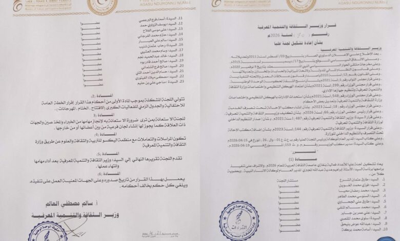 أصدر وزير الثقافة والتنمية المعرفية بحكومة الوحدة الوطنية الليبية، سالم مصطفى العالم، قراراً بإعادة تشكيل اللجنة العليا المكلفة بالإعداد لفعالية “بنغازي عاصمة الثقافة العربية 2026” والإشراف على تنفيذ برامجها. وذكرت وكالة الأنباء الليبية (وال) أن القرار يقضي بتولي إبراهيم هدية عبدالله المجبري، المدير العام للوكالة، رئاسة اللجنة.