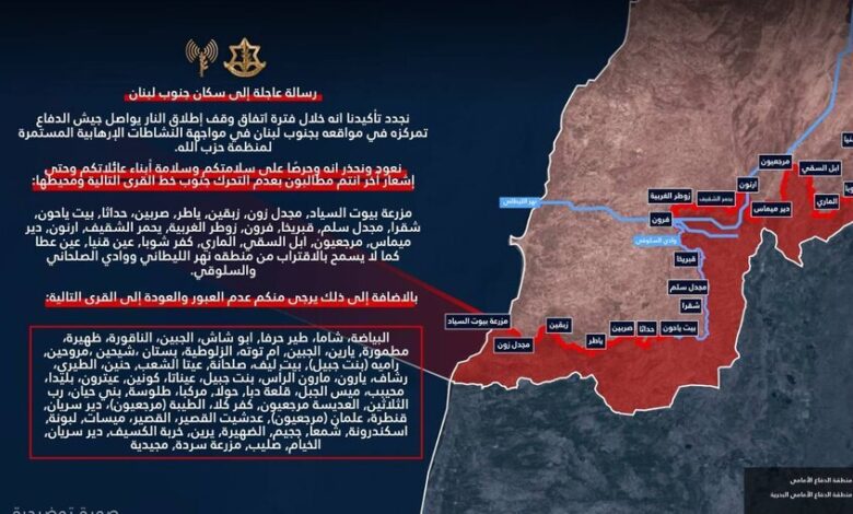 وشمل التحذير مناطق عدة من بينها الناقورة وبنت جبيل وميس الجبل وكفركلا والطيبة، إلى جانب مناطق أخرى في أقضية الجنوب، مع التشديد على ضرورة الالتزام بالتعليمات حفاظاً على السلامة.