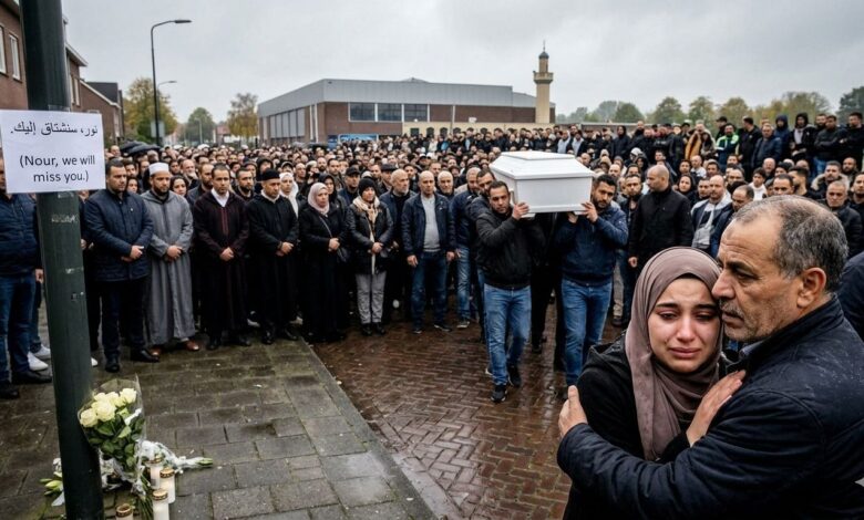شُيّع جثمان الطفلة “نور” ذات الأصول المغربية في مدينة فينلو الهولندية يوم الجمعة، في جنازة حضرها نحو 1500 شخص. وشاركت في مراسم التشييع التي أقيمت في المجمع الرياضي “هاجرهوف” بجوار مسجد “التوحيد”، جموع غفيرة من المسؤولين المحليين وأبناء الجالية المغربية.