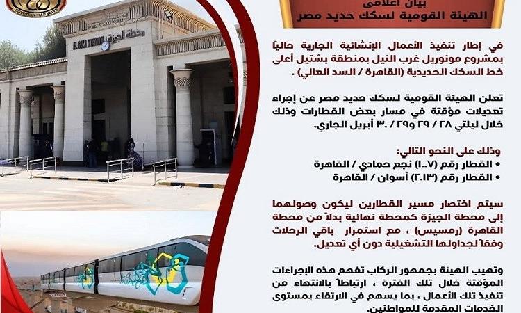 وأوضحت الهيئة أنه سيتم اختصار وصول القطارين بمحطة الجيزة بدلاً من محطة القاهرة برمسيس، مع استمرار باقي الرحلات وفقاً لجداولها التشغيلية دون أي تعديل.