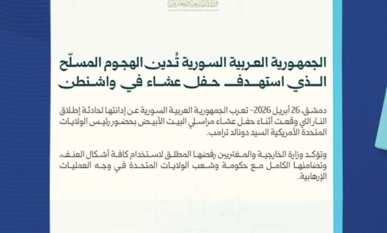 أعلنت الجهات الرسمية في سوريا، اليوم الاثنين، إدانتها الشديدة للهجوم المسلح الذي استهدف حفل عشاء رابطة مراسلي البيت الأبيض في العاصمة واشنطن ليلة السبت.