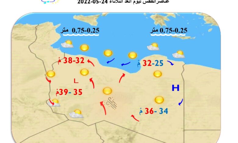 وفيما يخص ليبيا، يُرتقب أن تشهد أغلب المناطق درجات حرارة أعلى من المعتاد، مع احتمال حدوث موجات حر، خاصة في المناطق الداخلية والجنوبية، بسبب تأثير الكتل الهوائية الساخنة القادمة من الصحراء الكبرى.