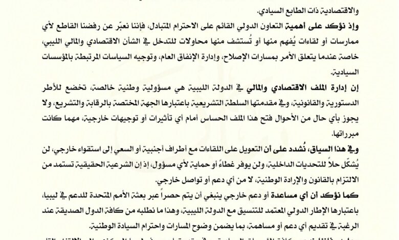 وأوضح النويري أن إدارة الملف الاقتصادي والمالي هي مسؤولية وطنية تخضع للأطر الدستورية والقانونية، وعلى رأسها السلطة التشريعية في ليبيا. وأكد أنه لا يجوز فتح هذا الملف أمام أي أطراف خارجية بما يمس القرار الوطني.